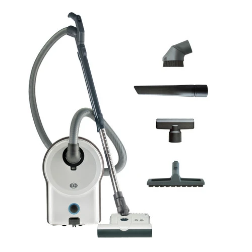 Made in Germany, the AIRBELT D4 Premium series is the best full-size, commercial-grade canister vacuum cleaners on the market today! The black or white-colored AIRBELT D4 Premium includes the 12-inch-wide ET-1 Power Head. The AIRBELT D4 Premium model is powerful, ultra-quiet and will provide years of reliable use! It features a full bag or clog indicator, a huge 1.5-gallon bag, three on-board attachments, an unmatched 40-foot cord and 52-foot cleaning radius, rubber-coated wheels to protect floor surfaces, a durable telescopic tube with quick-release connections, and a five-year parts and labor warranty. A one-of-a-kind LED indicator actually enables the user to optically monitor the level of suction power, and the soft AIRBELT bumper that surrounds the canister housing protects the vacuum, furniture and walls from incurring scuffs and scratches during use. The brilliantly designed tapered suction hose increases airflow, and its 320° rotating canister connection ensures smooth user and machine maneuverability. Because of ergonomically designed handles, users enjoy effortless control of cleaning heads that have 180° steering abilities and super low 3.5-inch horizontal cleaning profiles, which easily fit under beds and furniture. The AIRBELT D4 models’ ET-1 and ET-2 power heads effectively clean carpets and hard-floor surfaces and have excellent pet hair removal. They also offer manual brush roller shut off, so delicate flooring can be cleaned with straight suction. They have four-level manual height adjustment, and the extension side of their L-shaped contours makes cleaning under counters easy. They feature tool-free brush roller removal for replacement or bristle cleaning, and a warning light illuminates when brush height is set too high for optimal cleaning, the bristles are worn, or automatic shut off occurs due to a brush roller obstruction, which protects the belts, motor and carpets from damage.